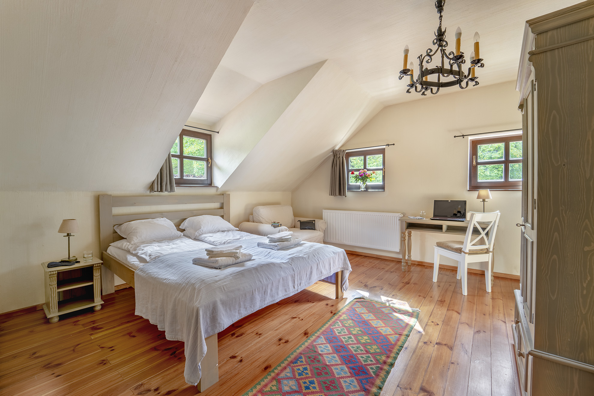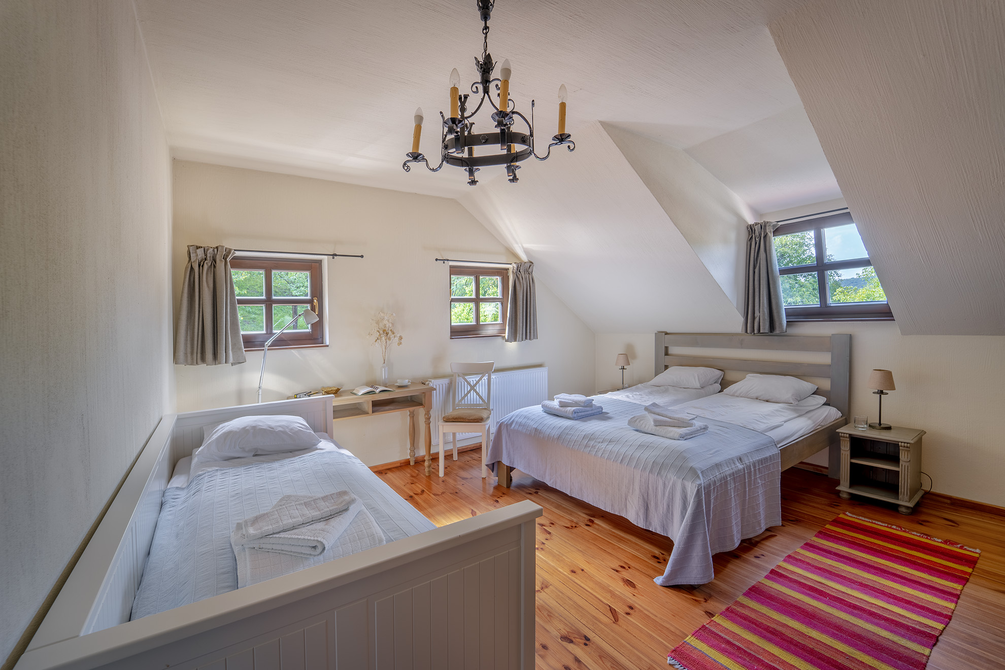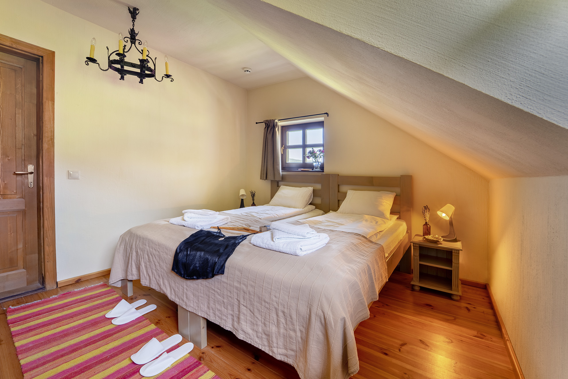 Mindegyik szoba modern bútorokkal rendelkezik, illetve a környező erdőre és dombokra nyílik kilátás.